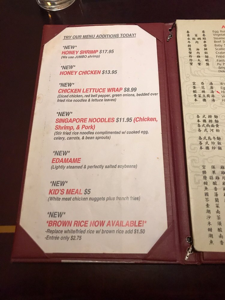 Large jumbo shrimp, sliced tender beef and chicken breast wok stirred w. fresh asparagus in savory house brown sauce.